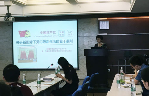 罗晓梅在授课中介绍了中央、院党组关于推进“两学一做”学习教育制度化常态化的要求和研究所具体部署,并肯定了此次党课内容特色鲜明,符合研究生的发展阶段和特点,明确了现阶段党内学习的重点和要点。她还对《关于新形势下党内政治生活的若干准则》进行了宣讲,解读了十八届六中全会确定的系列政治生活准则和党内监督条例中以党章为根本依据、坚持问题导向、继承和创新有机统一、体现约束与激励相结合的四个特点,明确了党员的责任和义务,强调了党员的纪律和红线。通过专题授课,她鼓励研究生党员们要不断丰富和提高自己的思想政治理论水平,坚定理想信念,成为未来优秀的科研工作者和党员。