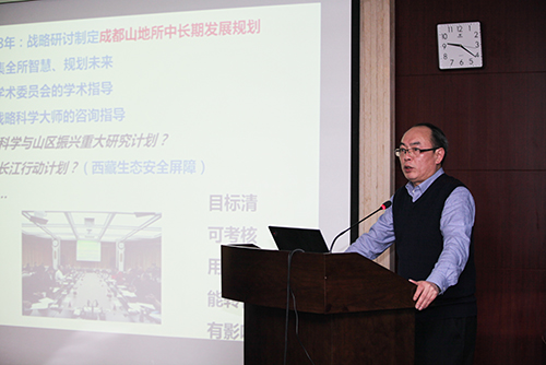 文安邦强调,进入新时代,成都山地所敢于迎接新挑战、抓住新机遇、适应新要求。面向未来,我们要深入贯彻落实十九大报告精神,对标生态文明建设主战场,开展更加系统深入的山地科学建设顶层设计与发展战略谋划,科学制定“山地所升级版”发展路线图,全面提升认知山地科学能力,积极适应新时代国家发展需求,科技支撑我国生态文明建设、保障山区发展安全,有效推动“一带一路”倡议的实施。会议还通报了特色所试点建设和防灾减灾创新研究院筹建前期工作进展。
