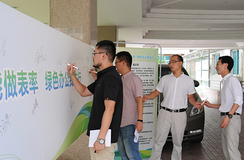 7月6日,中国科学院成都生物研究所在行政楼一楼大厅开展“行为节能做表率 绿色办公我先行”倡议活动。活动得到研究所各部门的大力支持,大家纷纷在活动的宣传板上签名,为建设行为节能、绿色办公研究所添砖加瓦。