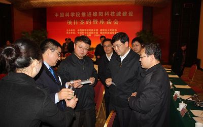 为落实绵阳科技城建设部际协调小组第九次会议精神,充分发挥中国科学院科技国家队的优势,积极支持绵阳科技城建设,由院高技术局、绵阳市政府主办,成都分院、绵阳科技城管委会承办的中国科学院推进绵阳科技城建设项目签约暨座谈会12月1日在绵阳隆重举行。院地双方就加快绵阳科技城建设进行了深入座谈,并成功签订了12项合作协议。中科院副院长江绵恒、阴和俊,院高技术局局长田静、副局长孟丹,成都分院院长彭宇行,成都分院党组书记、副院长袁家虎等出席了会议。四川省方面出席会议的有省政府副省长李成云,省政府副秘书长蔡竞,绵阳市委书记、市人大常委会主任吴靖平,市委副书记、市长曾万明等。