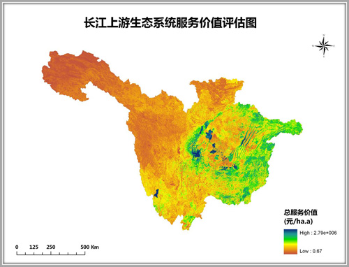 二是首次提出大尺度生态评估突出重要生态系统、关键地区、重点服务功能的评估思路,确定了长江上游地区关键生态系统服务类型。研究构建了生态系统服务物质量模型和价值量模型,采用指标权重法与生物物理模型法两种方法联合评估,多种方法相互验证,对长江上游生态系统土壤保持、水源涵养、碳固定、产品供给、文化等服务功能和价值进行评估。该成果从空间格局上反映了生态服务价值的空间差异,对在长江上游进一步实施生态补偿具有重要指导作用。