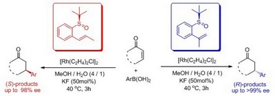 成都生物研究所天然产物中心廖建研究员课题组一直致力于发展基于手性亚砜的新型配体并应用于不对称催化反应。该小组设计出一类从单一硫手性源出发的新型手性亚砜-烯配体。该类配体在铑(Rh)催化的不对称芳硼酸对α,β-不饱和酮/酯类化合物1,4-加成反应中表现出优异的催化性能。研究还发现,改变烯烃上取代基的位置可以很好地控制产物的立体构型反转((S)-构型产物的ee值可达98%,(R)-构型产物的ee值可达>99%)。这是该现象的首次报道,此研究将有助于有机合成工作者在手性反转控制研究领域进行更加深入的探索和研究。