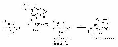 图式2:α-乙酰氧基-β-烯胺酯的不对称催化氢化硅烷化反应及紫杉醇侧链的合成