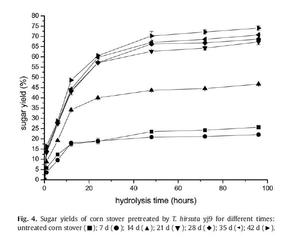 中国科学院成都生物研究所应用与环境微生物研究中心刘晓风课题组采用高效菌株—毛栓菌(Trametes hirsute) Y9对玉米秸秆进行了预处理研究,结果表明,进过42天的处理,木质素降解到达71.49%,处理后的原料酶解率到达了73.99%。对预处理后的原料电镜扫描后发现,预处理后的秸秆表面变得粗糙、纤维素纤维之间的空隙清晰可见,并且形成许多孔状。研究还证明了酶解糖化的生成量与木质素含量成反比,和纤维素、半纤维素的关联不大。