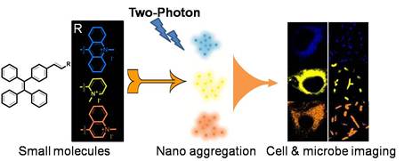 中国科学院成都生物研究所天然药物与临床转化重点实验室邵华武研究员课题组与国家纳米科学中心蒋兴宇研究员课题组合作发展了纳米尺度的有机双光子荧光染料并应用于细胞线粒体和微生物成像中。将聚集诱导发光的分子通过不同的化学修饰,应用到双光子激发的细胞线粒体及微生物定位中。该类聚集发光的荧光分子能够聚集成20-40nm作用的纳米颗粒,通过单光子激发或双光子激发,这些颗粒能够准确定位到细胞线粒体内,实现对线粒体的精准靶向,同时由于细菌与线粒体的相似性,这类纳米颗粒也可以对细菌微生物定位。