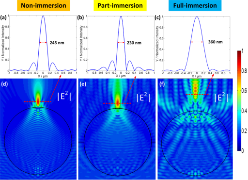 光电所研究团队近期发展出一种利用暗场显微有效提高成像高频成分含量的方法,具有降低成像低频成分的特点,结合微球超分辨能力,可实现更高对比度的微结构超分辨显微。该方法通过时域有限差分法模拟分析微球在不同浸没方式、浸没深度情况下的半高宽及光强值等来得到更优化的超分辨能力,模拟结果如图1所示。在此基础上通过二氧化硅和钛酸钡微球在不同浸没情况下观察特征尺寸为139 nm的硅光栅结构,实验结果如图2所示。可以看出,在暗场显微时成像对比度明显得到增强。