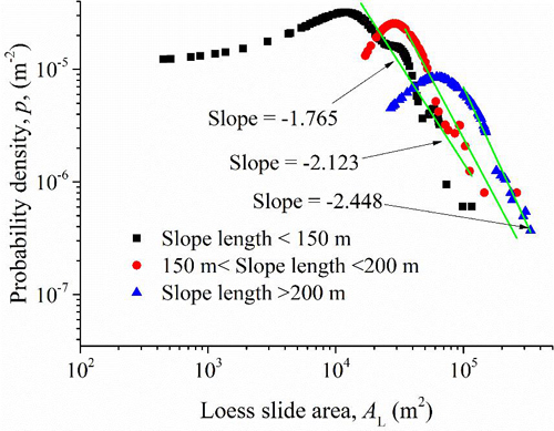 研究团队通过将数值模拟与野外调查相结合,探索了概率密度曲线“偏转效应”及其形成原因,认为概率密度曲线“偏转效应”是多因素影响下形成的,其中坡高、坡长、起伏度等因子对“偏转效应”形成起了重要的作用。研究团队进而分析了滑坡规模的控制性因素,建立了坡高与坡长和规模之间的定量关系。尽管在大量的野外观测中,滑坡规模会随着坡度的降低而增加,但是分析表明这种现象只是一种假象;这是因为坡度与坡长之间存在负相关关系。