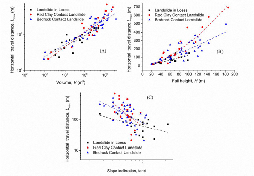 研究团队进一步分析了黄土滑坡的运动性和影响范围,结果表明黄土滑坡的水平运动距离会随着体积和坡高的增加而增加,随着坡度的增加而降低。等效摩擦因子会随着体积和滑坡能量的增大而降低。在黄土层内滑坡、黄土红粘土接触滑坡和黄土基岩接触滑坡这三种类型黄土滑坡中,黄土红粘土接触滑坡具有更强的运动性。研究团队基于误差分析,提出了最优化的黄土滑坡水平运动距离和等效摩擦因子的预测公式,这对于黄土滑坡防灾减灾具有重要的参考价值。