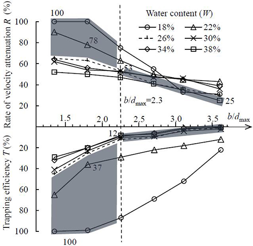 不同开口宽度的梳子坝对不同含水率的泥石流的速度减小率和固体物质拦截效率之间的关系