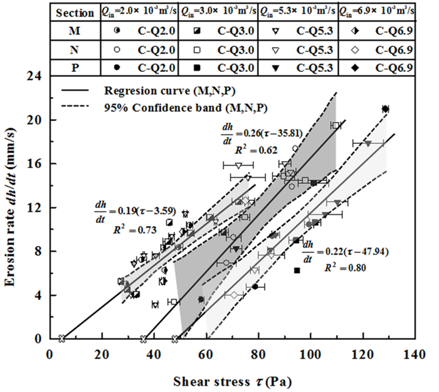 图2. 堰塞坝漫顶溃决过程中不同截面处坝体侵蚀率与坝上水流侵蚀力的关系
