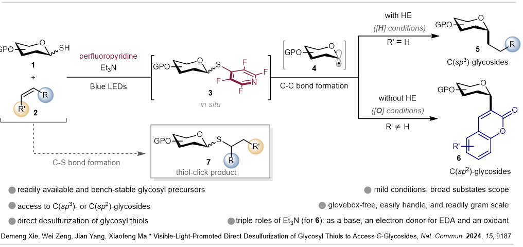 近日,成都生物研究所马小锋团队开发了一种在全氟吡啶存在的情况下,由易于获得和稳定的糖基硫醇制备C(sp3)/C(sp2)-糖苷的可见光诱导脱硫方案。反应通过四氟吡啶S-糖苷中间体进行,与Hantzsch酯(C-烷基糖苷)或Et3N(香豆素C-糖苷)形成EDA络合物。该方法为多种C-糖苷的高效、高立体选择性合成提供了一种温和的方法。