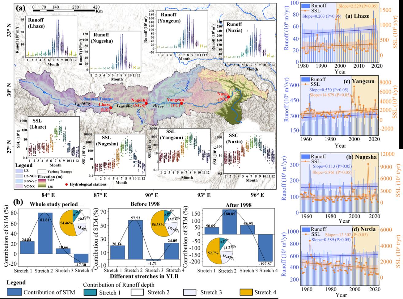 青藏高原作为“亚洲水塔”,不仅是全球气候变化的敏感区,也是我国乃至亚洲生态安全屏障的重要组成部分。该区正在发生的气温升高、降水模式改变、冰冻圈退化等气候及环境变化,深刻影响着寒区河流水沙的动态过程。雅鲁藏布江流域(雅江)是青藏高原最大河流,生态环境脆弱,水文过程受冰冻圈和地表环境变化影响较大。研究气候变化、冰冻圈退化及植被恢复对高寒区河流泥沙的影响机制,对于深入理解该区域及下游地区水-能源-粮食系统生态安全至关重要。