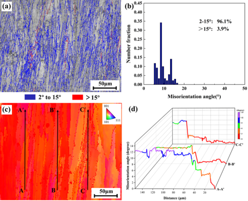 图1 同轴双波长激光粉末床修复DD5合金晶界分布及晶面取向偏差角统计图