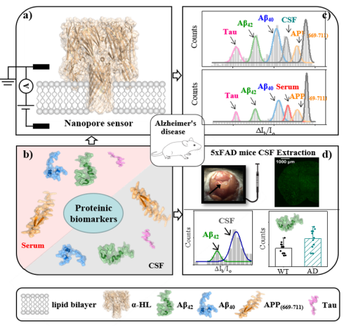 近期,重庆研究院王亮团队联合中国科学院深圳先进技术研究院脑认知与脑疾病研究所詹阳团队,基于多年的研究基础(Neuron. 2024,112,740. Nat Commun. 2024. 15,1036. Materials Today Physics,2024,42: 101370. Nano Letters 2025,25,1706.)共同开发了以纳米孔单分子检测技术为核心的阿尔茨海默生物标志物无标记、灵敏检测新方法。该方法利用蛋白电荷和结构差异,在单分子水平上对脑脊液和血液样本中的Aβ42,Aβ40,APP(669-711),Tau蛋白生物标志物进行了区分鉴定。同时,研究中结合商用ELISA试剂盒和脑斑块共聚焦成像,证实该方法可以通过直接检测阿尔茨海默转基因小鼠模型中脑脊液蛋白标志物,评估不同月龄老鼠大脑中Aβ42蛋白水平的变化。并且该方法对样本中不同Aβ蛋白标志物的检测灵敏度高于临床要求。目前研究还在进一步深入,旨在为临床阿尔茨海默病早期诊断提供技术支撑。