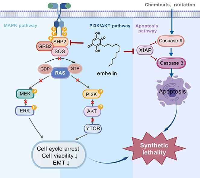 近日,成都生物研究所王飞团队在国际权威学术期刊Advanced Science(影响因子14.3,一区TOP期刊)上发表题为“Synthetic Lethality of SHP2 and XIAP Suppresses Proliferation and Metastasis in KRAS‐mutant Nonsmall Cell Lung Cancer”的研究论文,首次报道了来源于药用植物白花酸藤果中的天然化合物蒽贝素(Embelin)同时靶向SHP2和XIAP发挥合成致死效应抑制KRAS突变型非小细胞肺癌(NSCLC)的增殖和转移,为KRAS突变型肺癌的靶向治疗提供了全新的治疗策略和临床前证据。