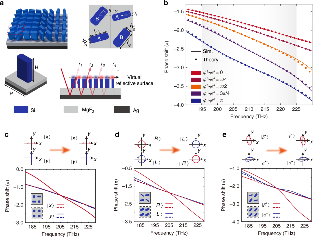 该创新的关键在于在保持结构高度恒定的前提下,通过偏振解耦的局域干涉调控正交偏振态入射下的等效路径长度,进而实现了偏振解耦的色散调控。为实现此类偏振解耦的局域干涉效应,研究团队采用超级单元结构,如图2(a)所示。该超级单元由一对交错排列的孪生纳米柱(A和B)构成,形成局域干涉系统,在亚波长结构上方产生虚拟反射面。虚拟反射面的反射率取决于相邻纳米柱之间的相位差,通过调控该相位差产生相长和相消干涉现象,虚拟反射率可在0%至100%变化。此物理机制下,部分反射光穿透虚拟反射面进入自由空间,其余能量则被反射回由超级单元阵列和金属层构建的谐振腔结构中。因此,等效路径长度可以被调控,从而调控其色散特性,如图2(b)所示。图2(c-e)验证了三对正交偏振态的独立色散调控,分别对应正交线偏振、正交圆偏振和正交椭圆偏振。以正交圆偏振态为例,可以看到对于第一种超级单元(实线框内的结构),当左旋偏振态入射时,纳米柱A和B之间的相位差为0。而对于右旋偏振态,相位差为π,从而产生虚拟反射面。等效路径长度增加使其具有更大的群延迟,如图2(e)中的红色实线所示。相反,对于第二种超级单元(虚线框内的结构),无论入射的偏振态是左旋圆偏振态还是右旋偏振态,纳米柱之间的相位差保持为0,导致几乎相同的群延迟,如蓝色和红色虚线所示。