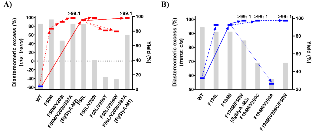 通过系统的定点突变与组合突变,研究团队揭示了“位阻调控”立体选择性的机制:第50位和第209位残基的大小共同决定了产物的立体构型。基于该机制,成功构建了三个关键突变体:SgStyA-M1 (F50L/V209I/G97A)具备顺式选择性 (dr > 99:1),SgStyA-M2 (F50M/V209I/G97A)同样为顺式选择性 (dr > 99:1),SgStyA-M3 (F194M/F50W)则表现出反式选择性 (dr > 1:99)(图2)。