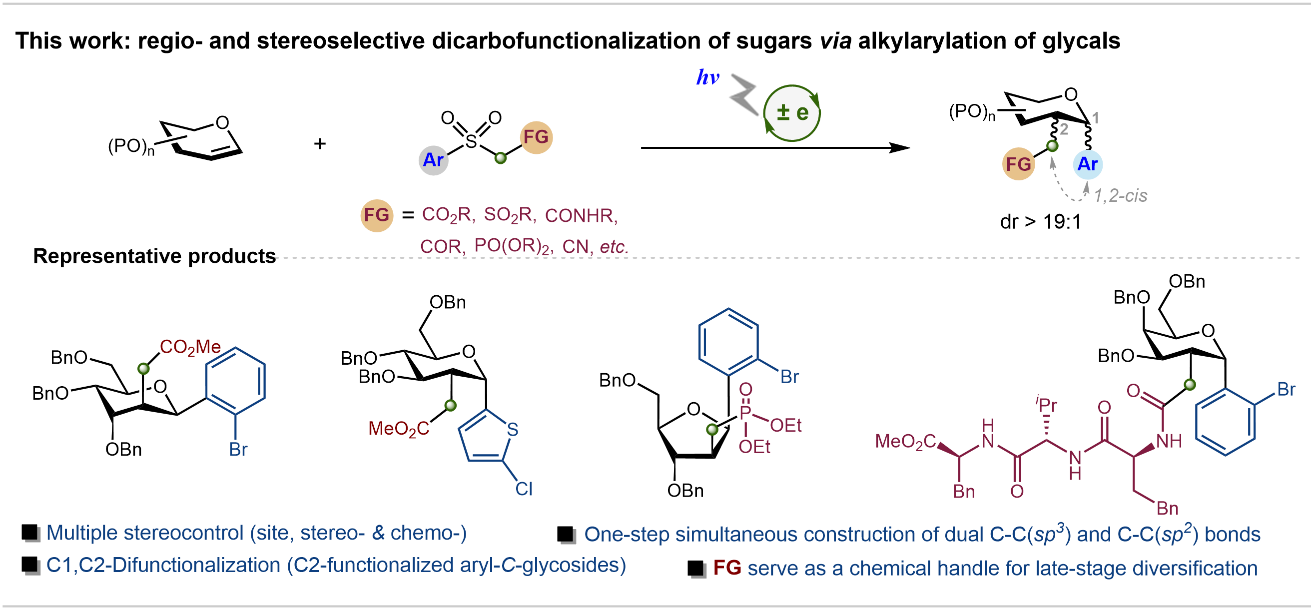 马小锋研究员团队创新性地将光氧化还原催化与自由基Smiles重排相结合,开发出一种糖烯区域和立体选择性1,2-烷芳基化反应,成功实现了糖环双位点的精准同步碳官能团化修饰,构建了一个“模块化、灵活”的糖多样化平台,既解决了“如何精准修饰”的科学问题,又满足了“可放大”的应用需求。该成果以“Streamlined Sugar Diversification via Photoredox-Catalyzed Regio- and Stereoselective 1,2-Alkylarylation of Glycals”为题,发表在国际化学顶级期刊Angew. Chem. Int. Ed.上(影响因子16.9),成都生物所杨建博士和谢德盟青年副研究员为文章共同第一作者,马小锋研究员为该论文通讯作者。