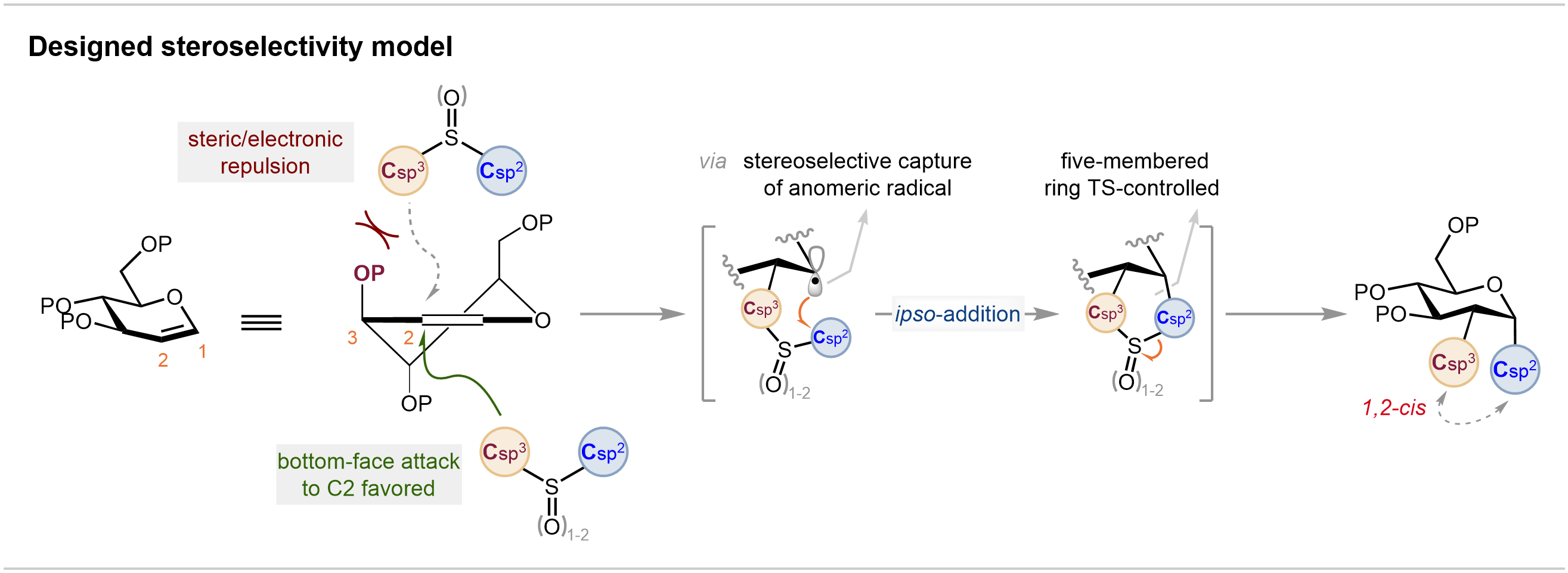 目前学界对糖分子单一位点(如C-糖基化)的修饰技术已较为完善,但药物研发往往需要对糖环多个位点进行差异化修饰,以构建具有三维结构多样性的分子库,从而筛选出更高活性的候选药物。现有糖烯双碳官能化技术的瓶颈在于,它既难以实现差异化碳基官能团(如烷基与芳基)的同步引入,更在于无法对最终产物的立体构型进行精准构筑。针对这一难题,该团队提出了双重立体控制反应机制的解决方案:通过糖烯C3位取代基的“空间导向”作用,以及自由基Smiles重排过程中的顺式稠合双环过渡态,反应可高效生成1,2-顺式、2,3-反式构型的产物。以葡萄糖烯为模型底物时,目标产物2-C-支链芳苷的产率达84%,且仅生成α-构型(dr > 19:1),解决了传统反应“立体混乱”的难题。