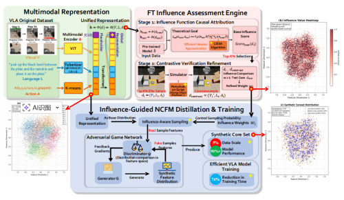 构建高效决策模型的数据精炼新路径。视觉-语言-动作(VLA)模型是支撑机器人理解世界与执行复杂任务的关键技术。然而,此类模型的训练高度依赖海量数据,带来巨大的计算与存储开销,使得高性能模型难以在资源受限的场景中部署。现有“以模型为中心”的优化方式(如模型压缩与蒸馏)虽能减轻部分负担,却未从数据层面根治效率瓶颈。针对这一挑战,研究团队提出FT-NCFM影响力感知数据蒸馏框架,开辟“以数据为中心”的高效模型训练新方向。其核心理念是:模型性能的关键不在数据量的多少,而在数据的质量与信息密度。FT-NCFM通过两大创新模块实现数据层优化: