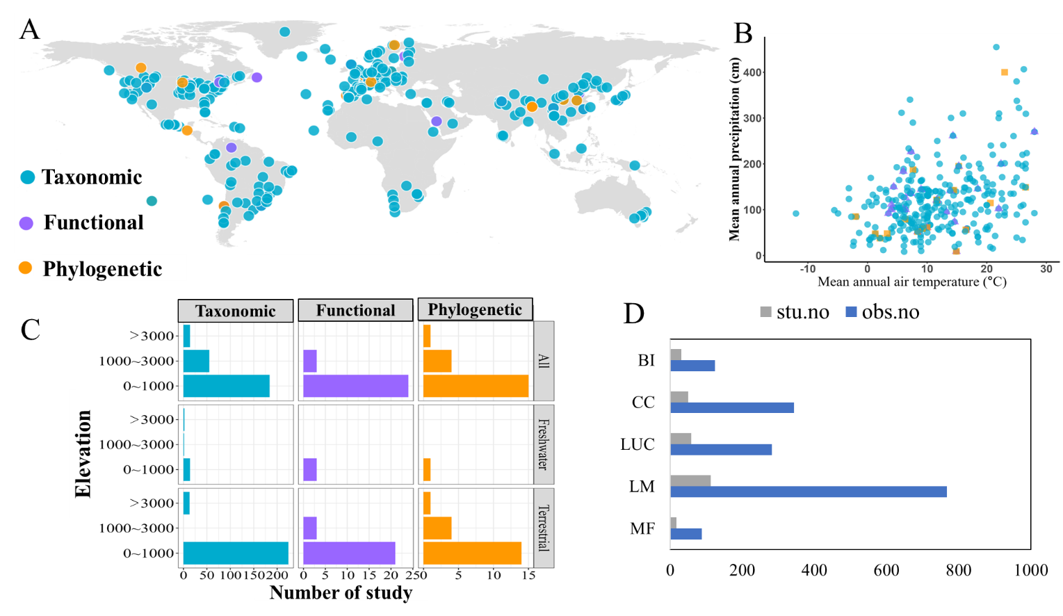 (2)不同多样性维度的响应不同:研究凸显了多维视角的重要性。例如,气候变化虽降低了分类和功能β多样性,却增加了系统发育β多样性。这表明,仅关注物种组成的变化可能无法全面揭示群落结构的改变。