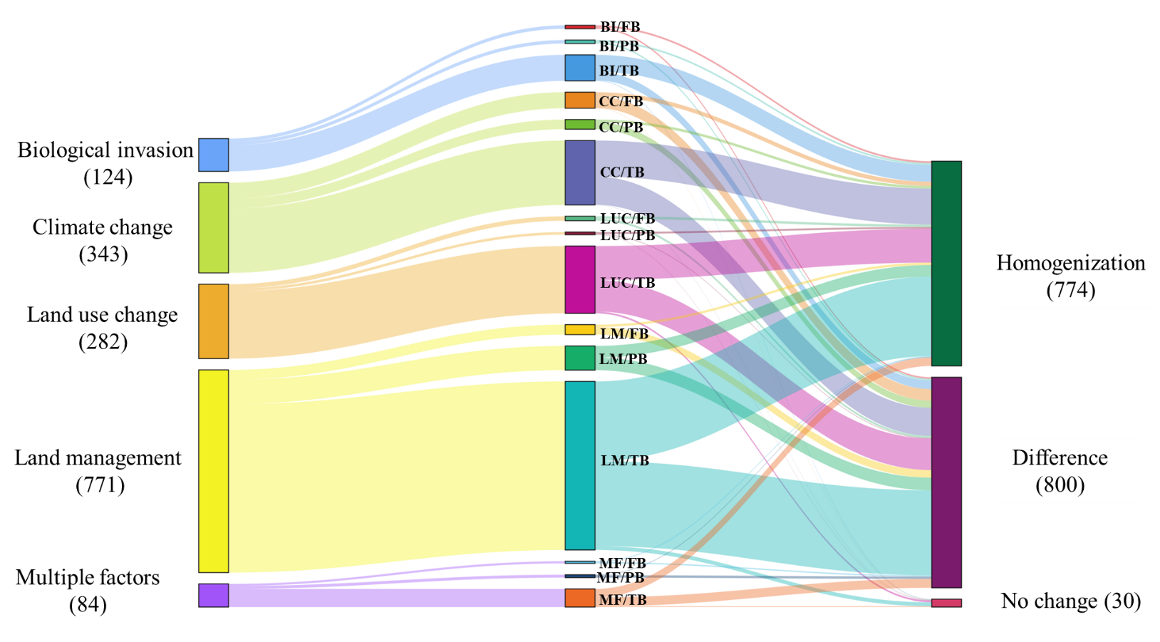 (1)不同驱动因子的效应各异:气候变化与生物入侵普遍导致植物β-多样性下降,即促进同质化;而积极的土地管理措施(如生态修复、减少放牧、计划火烧)则能有效提升β多样性;土地利用变化(如城市化、栖息地破碎化)及多因子交互作用的影响则较为多变。