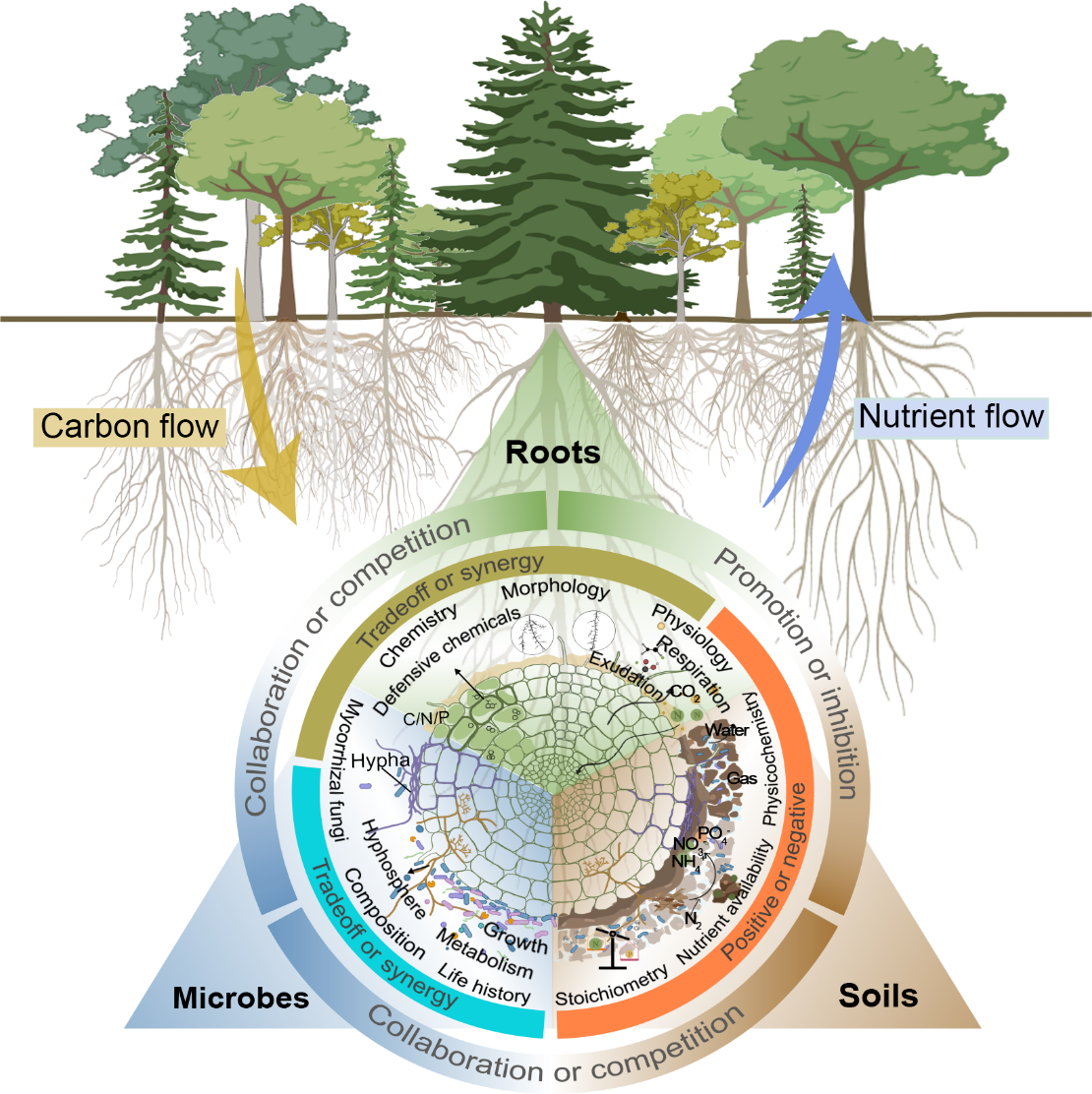 根际作为陆地生态系统物质、能量和信息交换最为剧烈复杂的关键界面,以根系分泌物为代表的根系活动深刻调控着根系-微生物-土壤各核心功能单元间“自上而下”的碳流与“自下而上”的养分流,形成一个以根际互作为核心、“牵一发而动全身”的根际生命共同体闭环系统。相应地,在根际微生态系统中,碳流与养分流的密切耦合在根际区驱动了一系列独特的根系–菌根真菌–微生物–土壤功能性状(即根际功能性状),且各功能单元性状之间存在着复杂而精密的协同与权衡关系,在调控植物环境适应策略与生态系统功能稳定等方面扮演着重要的生态与进化学意义。然而,受制于研究技术及根际微环境的高度异质性和复杂性,目前已有研究更多将根系、微生物和土壤等功能单元孤立地进行分析,而严重缺乏针对根际多功能单元性状协同策略及其生态学功能的系统性整合,使得现有对于根际在调控农林生态系统功能中的作用科学认识极为模糊,严重制约了人们根际在高效调控农业生产提质增效、退化生态系统功能恢复与减缓气候变化中的应用实践潜力。