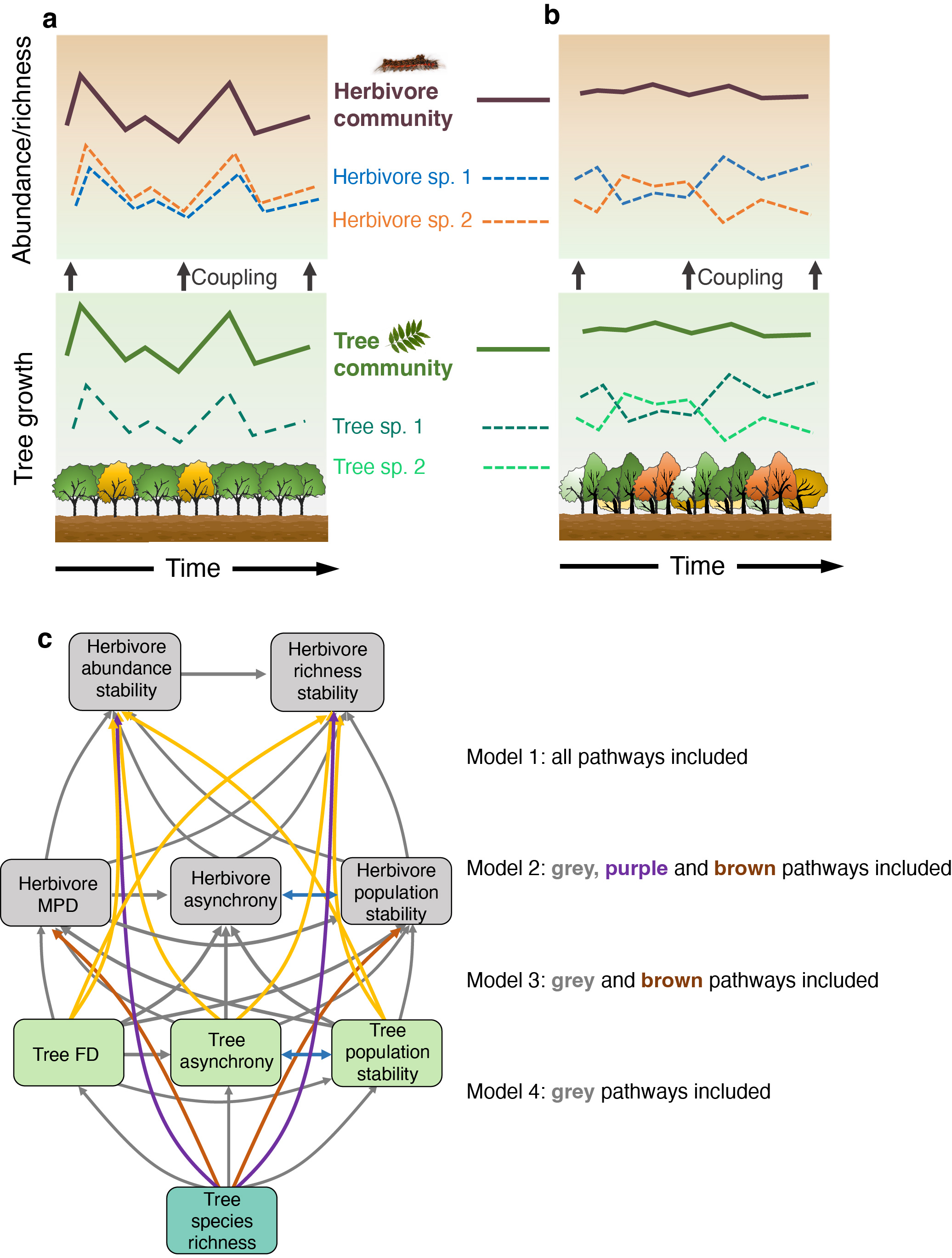 近日,成都生物研究所王明强副研究员依托亚热带森林生物多样性与生态系统功能实验平台(BEF-China),联合中国科学院动物研究所朱朝东研究员、中国科学院植物研究所马克平院士、刘晓娟研究员、德国哥廷根大学Andreas Schuldt教授、Georg Albert博士以及多家单位研究人员,系统揭示了树种多样性、树木生长稳定性与植食性昆虫群落稳定性之间的跨营养级耦合机制。相关研究成果以“Asynchrony and functional diversity couple herbivore community dynamics to host plant diversity”为题发表在Nature Communications。研究基于BEF-China实验样地中从单一种植到24种混交的树种多样性梯度,整合了2017—2022年连续6年、17个采样季的鳞翅目幼虫群落数据(共计17,850个个体),并结合树种的功能多样性、生长异步性和种群稳定性等指标,系统解析树种多样性对植食性昆虫群落稳定性的直接与间接作用路径(图1)。主要研究结果表明: