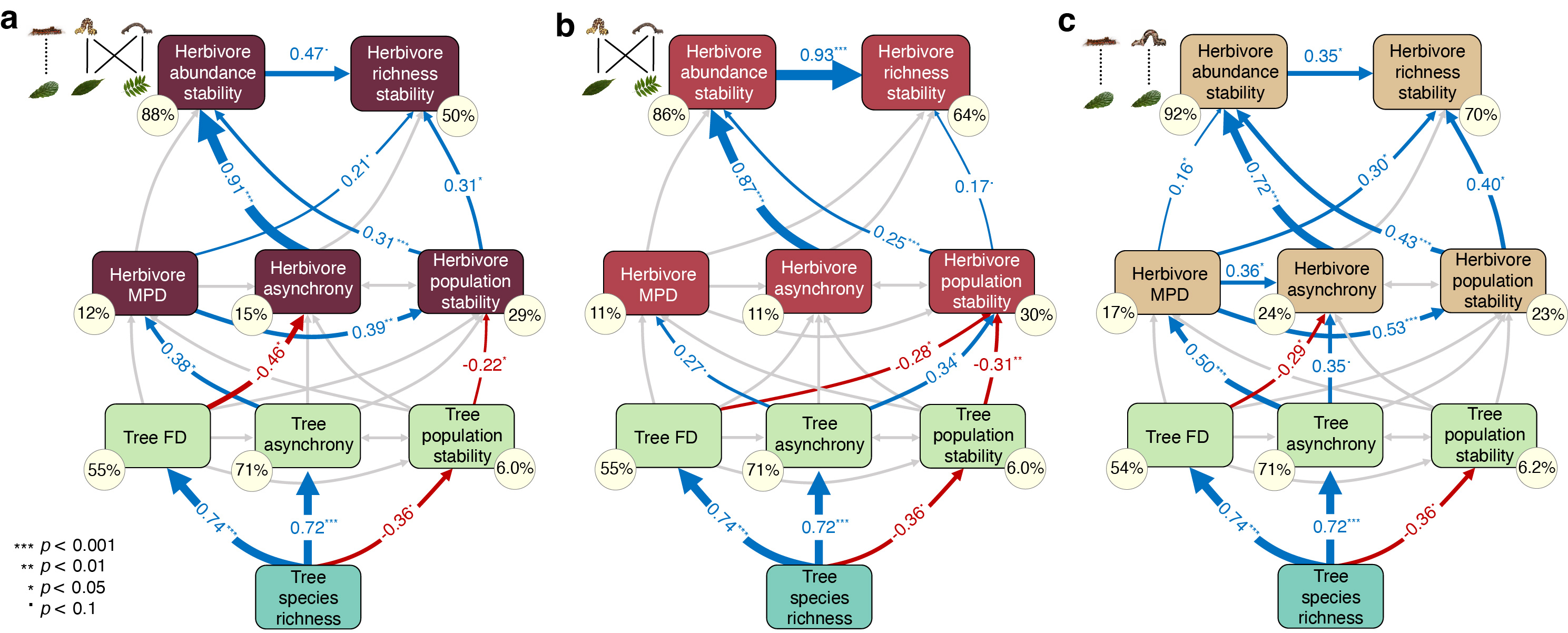 分析结果显示,树种丰富度并非直接影响幼虫群落稳定性,而是通过改变树木功能多样性、树木生长异步性和种群稳定性,进而调控植食性昆虫的系统发育多样性、群落异步性与种群稳定性,最终影响其多度和物种丰富度的时间稳定性。