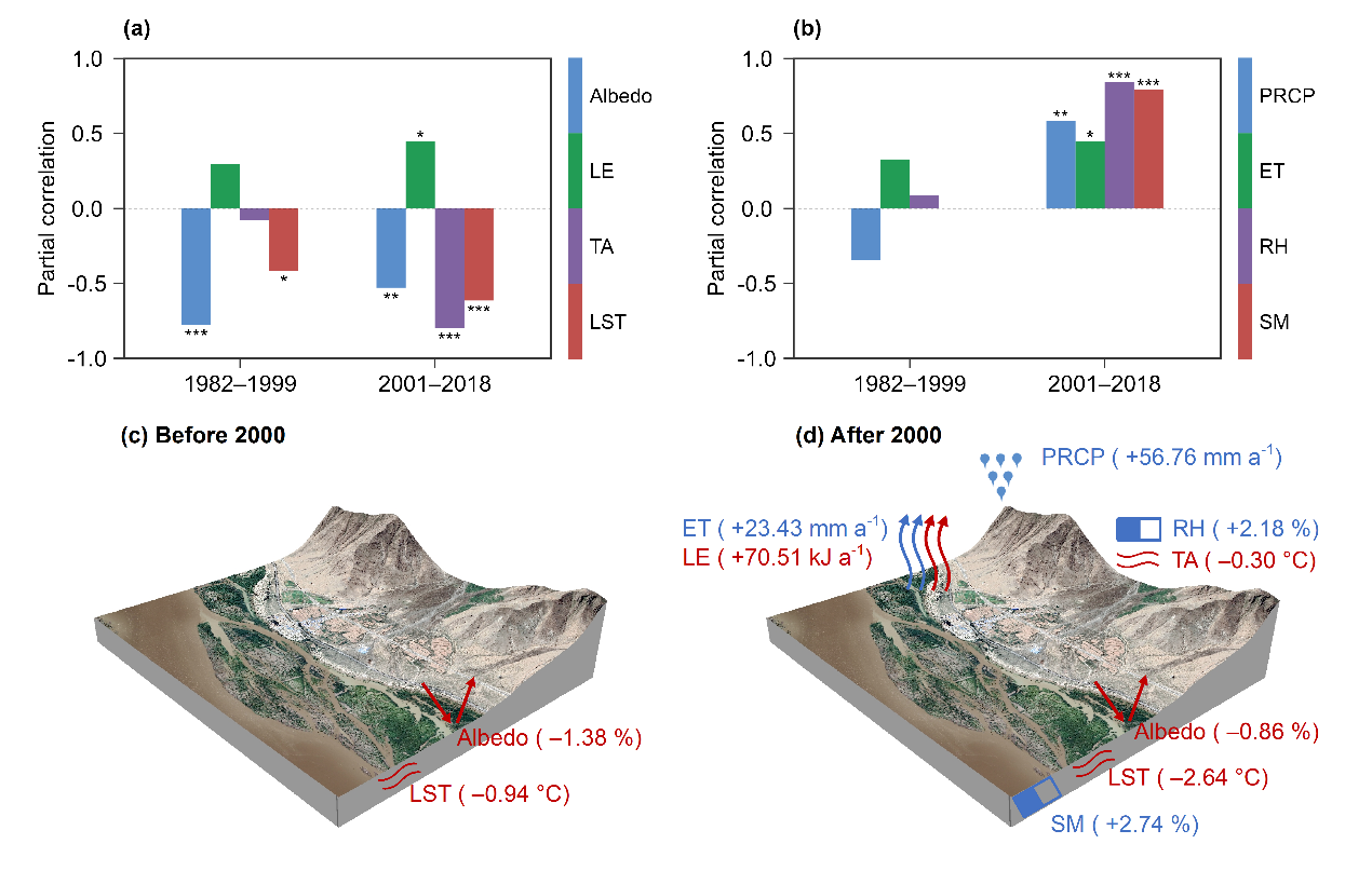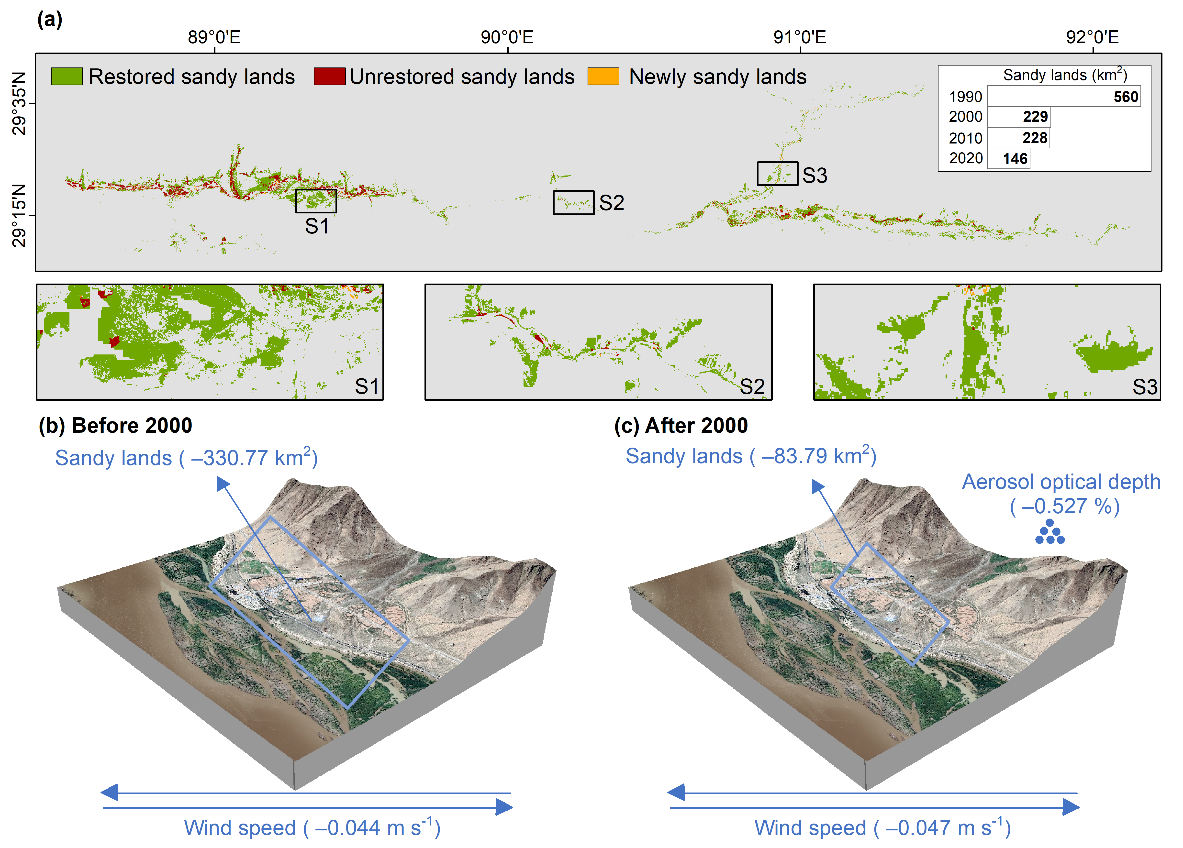 在全球升温与土地退化的双重挑战下,青藏高原雅鲁藏布江中游流域——这片被誉为"世界屋脊粮仓"的土地,通过持续40年的系统性植树造林工程成功逆转生态退化趋势。面对气候变化与人为活动引发的荒漠化威胁,在科学规划和政策引导下,该区域构建起兼具生态屏障与生产功能的绿色发展范式。基于所述背景,成都山地所山地地表过程智能监测与模拟团队联合国内外多家科研机构科研人员深入雅鲁藏布江干旱河谷布设野外观测网络,首次结合卫星遥感大数据量化评估植树造林的长时序生态效益(图1),揭示了植树造林对荒漠化逆转、区域水热平衡与农业系统的协同调控机制。