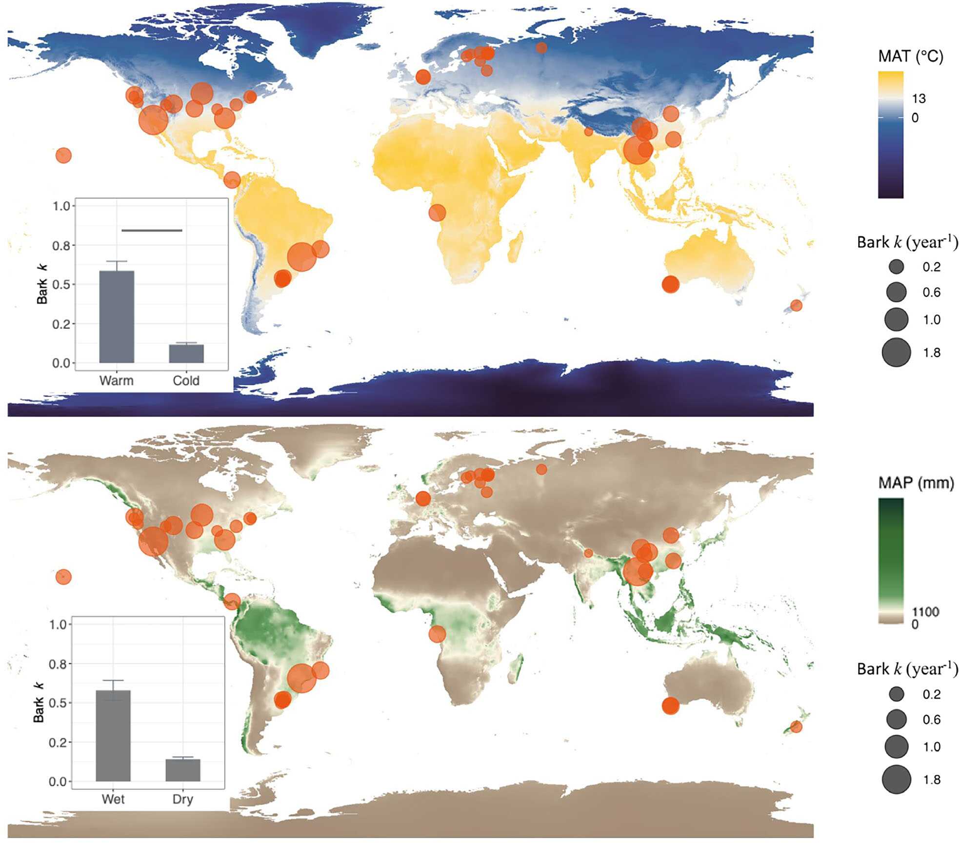 研究发现,树皮的全球平均分解速率是树干(树皮自然存在)的2.9倍。树皮分解速率呈现显著的纬度梯度效应,分解常数从北方地区的0.093/年向热带地区的1.339/年递增。被子植物树皮分解常数为0.450/年,裸子植物为0.198/年。年平均温度、年平均降水和树皮磷含量是最主要的调控因素。气候变化背景下不同气候区树皮分解的响应具有空间异质性,树皮的分解速率在气候温暖/湿润地区会降低,在气候寒冷/干燥地区会增加。构建全球碳循环模型时引入树皮分解速率十分必要,直接关系到对全球气候变化下碳源/汇的预测精度。将树皮效应纳入造林差异化策略制定,是生态工程实践基于自然解决方案的优先选项之一。