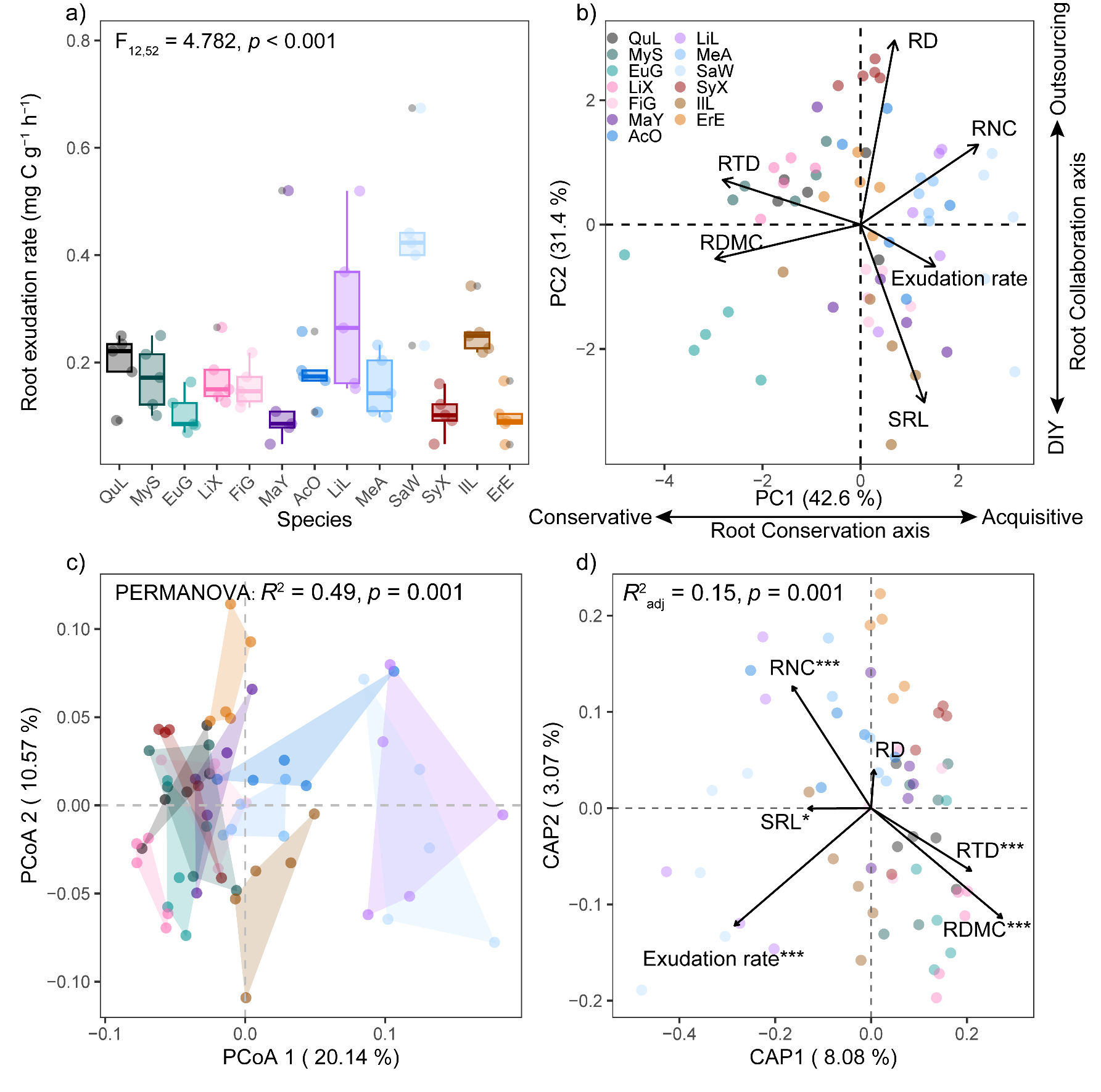图1 根系分泌物速率及组成的种间变异规律及其与根系性状的关系
