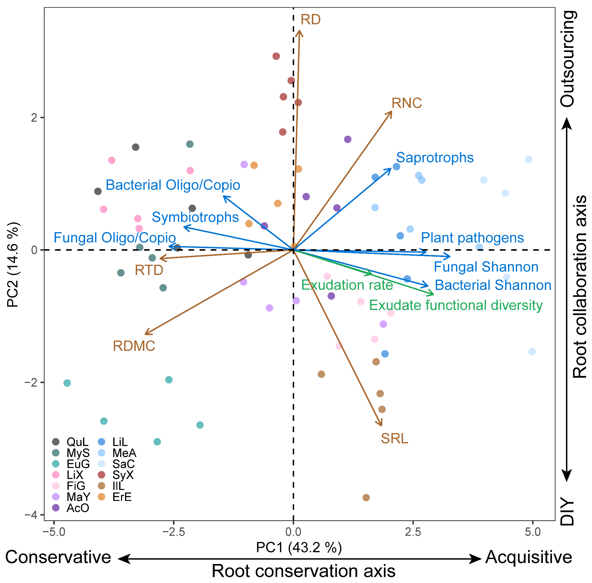 针对这一研究空白,中国科学院成都生物研究所尹华军团队以西藏墨脱亚热带森林中13种优势共存树种为对象,综合分析了各树种细根功能性状、分泌物分泌速率与代谢组成以及根际微生物功能特征,系统辨识了根系分泌物速率和组成在根系经济空间框架中的功能定位,及其在串联根系—微生物功能耦合中的核心作用。研究发现,沿根系资源“获取型—保守型”梯度,不同树种的根系分泌速率与化学组成呈现出显著的协同变化。具体地,随着树种策略从保守型向获取型转变,树木的根系分泌速率增加,其化学组成多样性也更为丰富(图1)。这种兼具“高通量—多样化”的根系分泌策略进一步招募了富营养型、快速生长微生物类群的聚集,从而构建起根系策略与根际微生物功能密切耦合的代谢桥梁(图2和3)。该研究首次证实了根系分泌物化学多样性是驱动根系与根际微生物等核心功能单元协同运作并促进共存树种地下策略分化的关键调控枢纽。