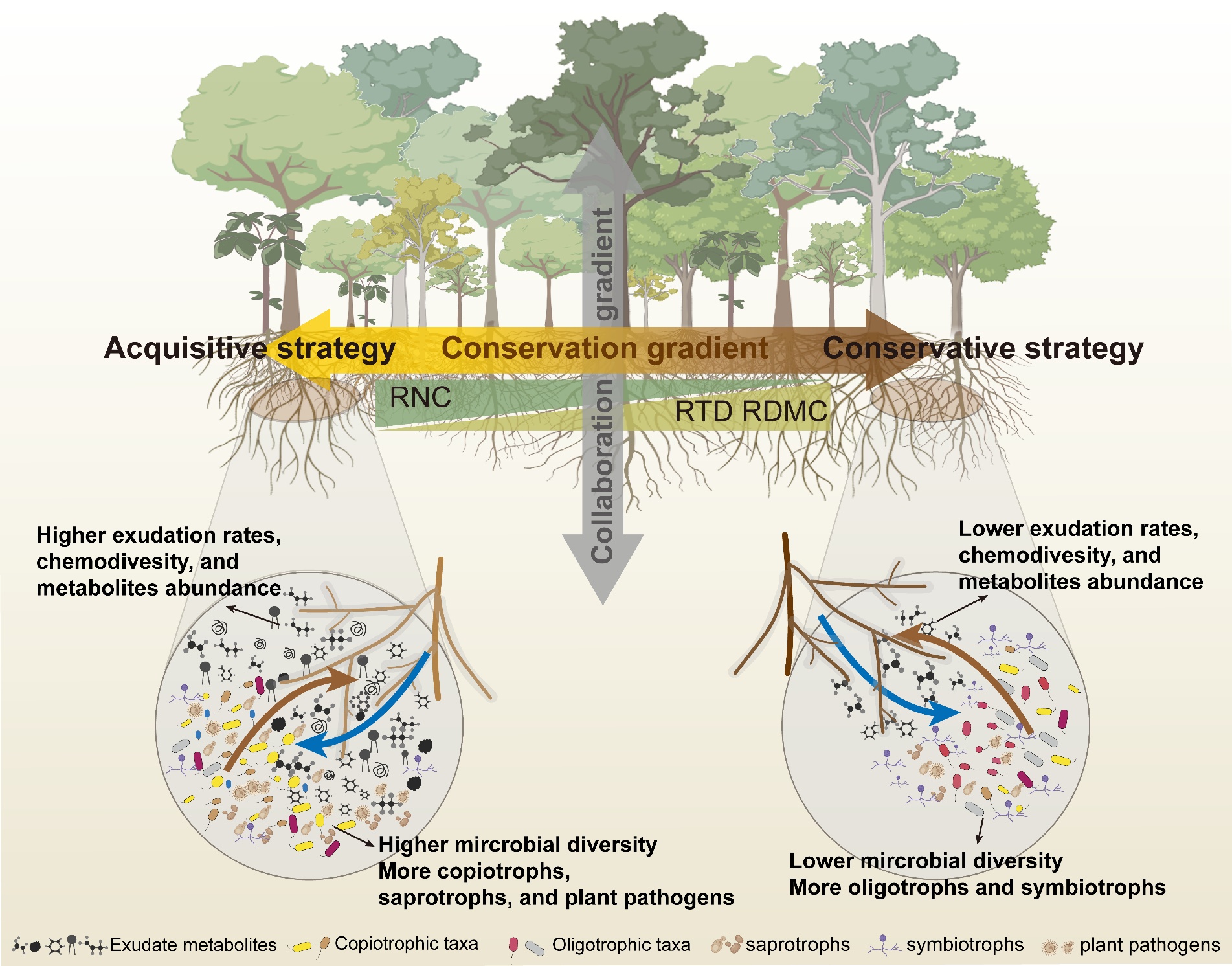植物根系在长期进化过程中形成了多样化的资源获取策略,这些策略不仅决定植物对多变环境的适应能力,也是维持森林群落物种共存与生态系统功能稳定的重要基础。近年来,根系多维经济空间理论的提出为科学认识植物地下资源获取策略提供了新的研究范式。然而,现有研究多聚焦于根系自身形态、生理和化学性状解析,却忽略了以根系分泌物为代表的根系活动介导的根际区根系—微生物等功能共同体在植物养分获取策略中的关键作用及其生态重要性。实际上,根系分泌物作为植物地上光合碳进入根际的主要途径,是链接根系、微生物与土壤等核心功能单元互作的关键物质、能量和信息媒介。特别地,根系分泌物通过耦合根系—微生物—土壤之间“自上而下”的碳流输入与“自下而上”的养分反馈,在根际尺度上驱动多功能单元的高效协同运作,进而构建起一个以根际互作为核心、牵一发而动全身的“生命共同体”闭环系统。在该系统中,根系分泌物既为微生物提供能量,又通过化学信号参与防御调控和功能微生物招募,对植物养分获取及其生态系统结构和功能产生深远影响。然而,受制于根际环境高度复杂性及其研究技术限制,这一关键调控枢纽在介导植物环境适应性策略、物种共存机制等方面的重要生态学意义研究极为匮乏,理论认识薄弱。