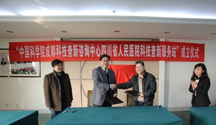 12月17日,中科院成都文献情报中心与四川省人民医院“科技信息服务合作协议”签字仪式在四川省人民医院举行。成都文献情报中心主任张志强和四川省医学科学院、四川省人民医院副院长蔡力代表各自单位在科技信息服务协议上签字,并共同为“科技查新服务站”揭牌,“中科院成都科技查新咨询中心四川省人民医院科技查新服务站”正式成立。