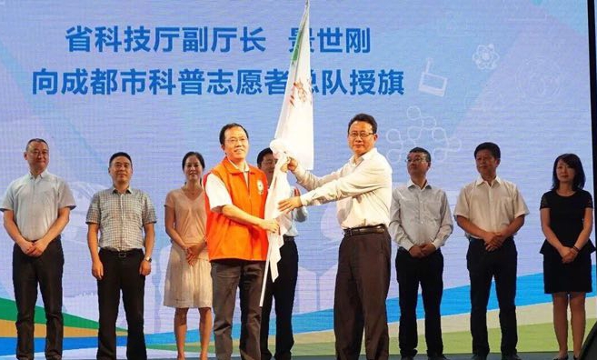 四川省科技厅副厅长景世刚向成都市科普志愿者总队授旗