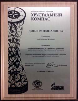 5月23日,在俄罗斯地理学会组织举行的颁奖大会上,由中国国家自然科学基金委员会与俄罗斯基础研究基金会联合资助的项目“地震(火山)活动后大规模泥石流危险性评价的关键参数确定及应用”针对俄罗斯勘察加半岛(Kamchatka)的三座火山“Three volcanoes”的联合科学考察获得俄罗斯第二届国家地理“水晶罗盘”奖(National geography award the Crystal Compass)。该奖项用于表彰在地理学、生态学、环境保护、历史和文化遗产等方面有突出贡献的集体和个人。