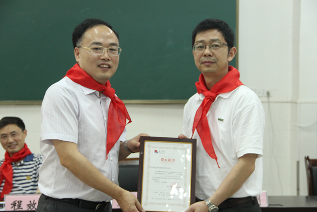 与会领导为受资助的中小学生发放爱心款和文具,鼓励他们努力学习。施崇刚副书记代表共青团重庆市委授予我院《希望工程--爱心证书》,重庆院将张景中院士编撰的《漫话数学》等系列图书赠与澄江镇小学图书馆。