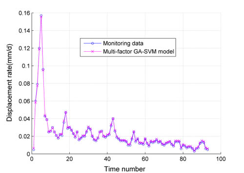 滑坡变形监测结果与GA-SVM模型预测结果的比较