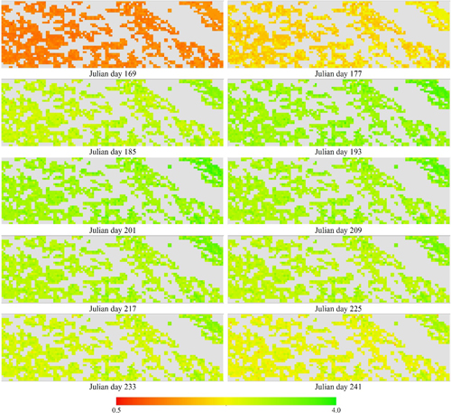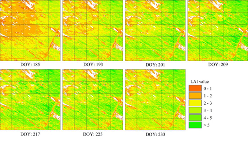 基于遥感观测与CERES-Maize模型同化的时间序列LAI估算结果