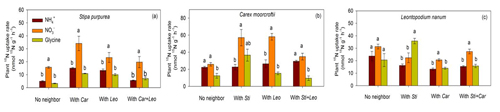 研究认为,青藏高原冻融区根系特征和种间关系显著影响植物不同形态氮素吸收效率研究发现,粗根有利于提升高寒植物抗冻融能力,但会显著降低其氮素吸收速率;比根长和比表面积是决定NO3−, NH4+ 和甘氨酸吸收的关键指标。冻融环境下紫花针茅具有稳定的氮素吸收偏好(NO3−),而青藏苔草和矮火绒草对氮素吸收偏好会因临近物种的改变有所调整;紫花针茅-青藏苔草组合可以使得两者均保持高效的氮素吸收效率。