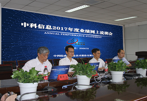 5月4日,中科院成都信息技术股份有限公司在全景网路演天下平台举行2017年度网上业绩说明会。公司总经理付忠良、副总经理、董事会秘书尹邦明、财务总监刘小兵、独立董事黄泽永、保荐代表人国信证券投行部执行总经理谭杰伦担任会议嘉宾与投资者在线互动。
