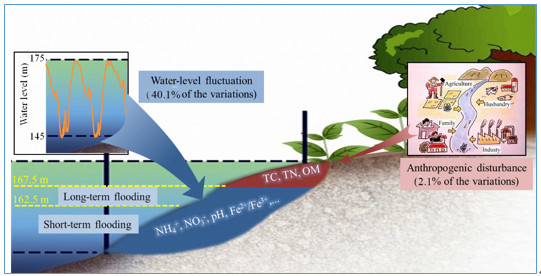 三峡水库运行后,库区水位周期波动,库岸在最高水位(175 m)与最低水位(145 m)之间形成了水库消落带。周期性的淹没与出露改变了消落带土壤的基本性质,同时,库区人类活动排放(如生活污水、农业面源等)也会对消落带土壤产生影响,形成水位波动与人类活动的“双重干扰”。水位波动与人类活动分别如何影响消落带土壤理化性质的变化?二者相对作用如何? 针对上述问题,重庆研究院科研团队通过在三峡库区选择两种不同干扰强度的典型消落带区域,对土壤理化性质开展了连续两年的跟踪观测,基于此建立了针对消落带土壤影响因素与空间分布的系列模型。