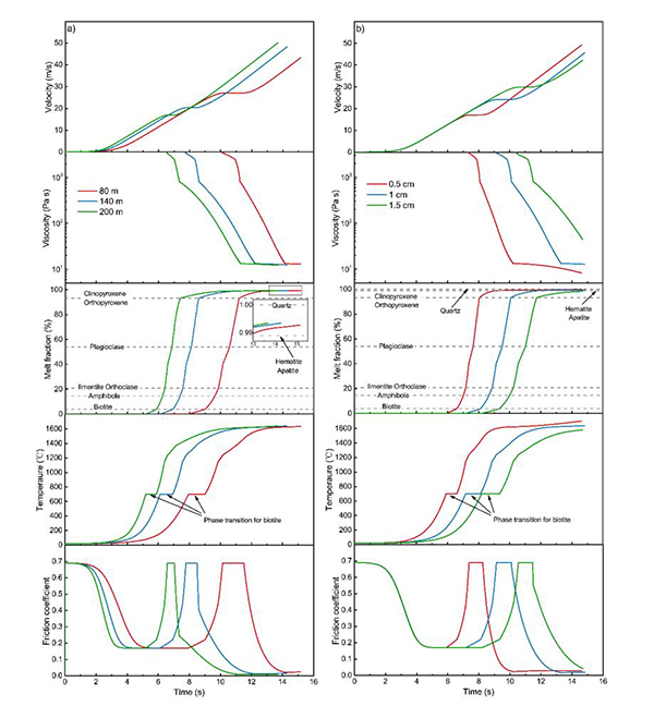 该研究将热熔过程划分为三个阶段:弱化阶段、剪切强化阶段和热熔润滑阶段,并分别构建了三阶段滑带温度场与运动演化方程,定量评价高速滑坡运动演化过程中速度、粘性系数、熔融体体积分数、温度及摩擦系数变化趋势,探索不同功率转化系数下,热熔现象对不同规模整体性滑坡运动的影响。高速滑坡第一阶段摩擦弱化机理主要缘于剪切带颗粒破碎和闪热,摩擦系数演化趋势可采用指数衰减方程描述。第二阶段摩擦强化主要有两个原因:其一是熔融体填充部分孔隙,增加了滑动面接触面积;其二是熔融体和固体颗粒混合增大了剪切带强度,基于矿物选择性熔融特性,并考虑熔融体体积分数,量化剪切带强度增量。第三阶段:当熔融体含量达到一定程度时,滑体和基岩被熔融体分开,滑坡剪切阻力主要由粘滞阻力提供,在此阶段,主要考虑温度、化学成分、碎屑含量、含水量等因素对粘性系数的影响,建立热传导方程和应力场方程,计算不同滑体厚度和剪切带厚度条件下各参数的变化趋势。