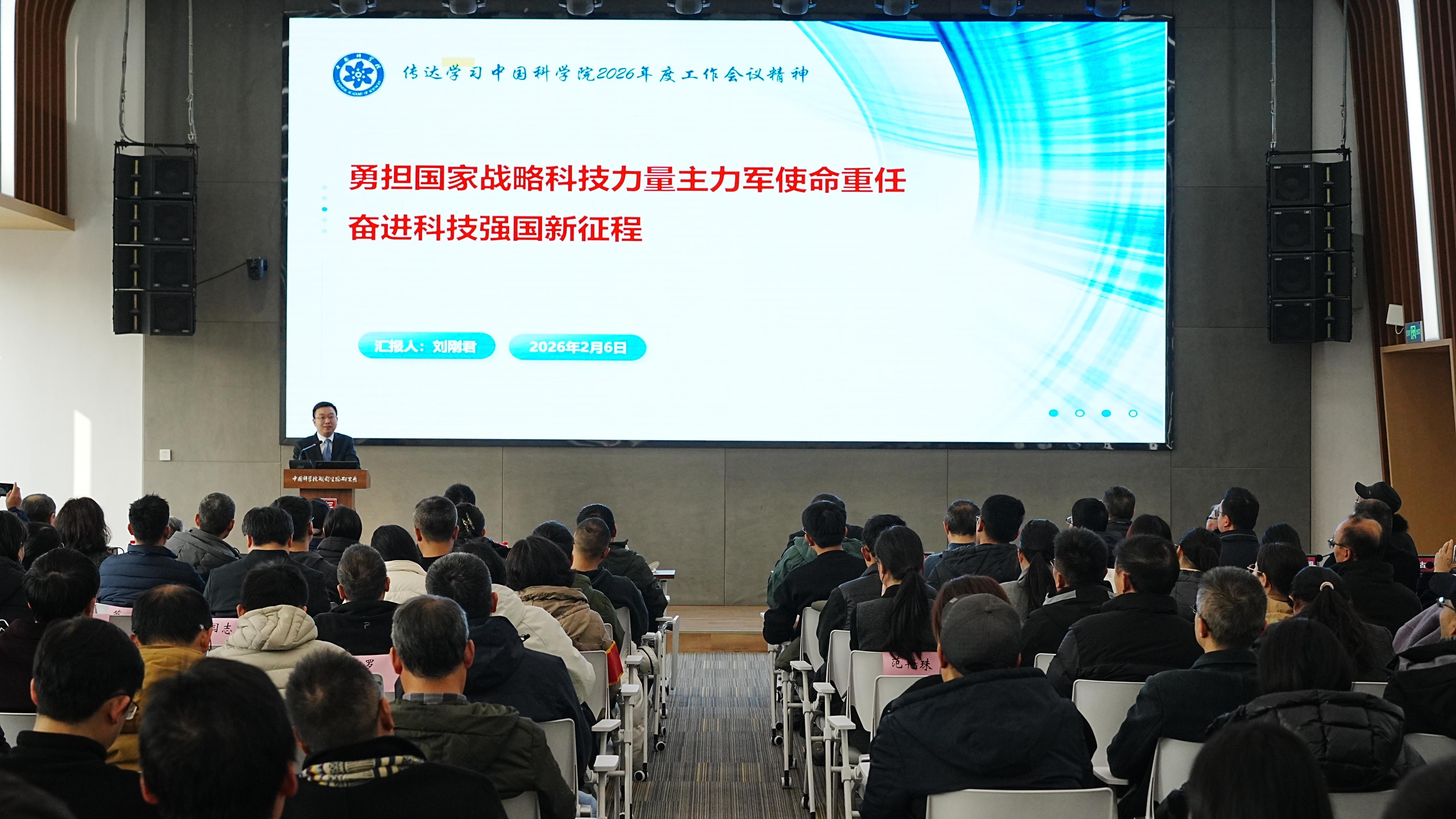 党委书记、副所长刘刚君介绍了2026年度院工作会议基本情况,重点传达了中国科学院院长、党组书记侯建国所作的工作报告——《勇担国家战略科技力量主力军使命重任 奋进科技强国新征程》的核心内容,并结合研究所的实际情况,对报告内容进行深入解读,并研究所下一步贯彻落实提出要求。