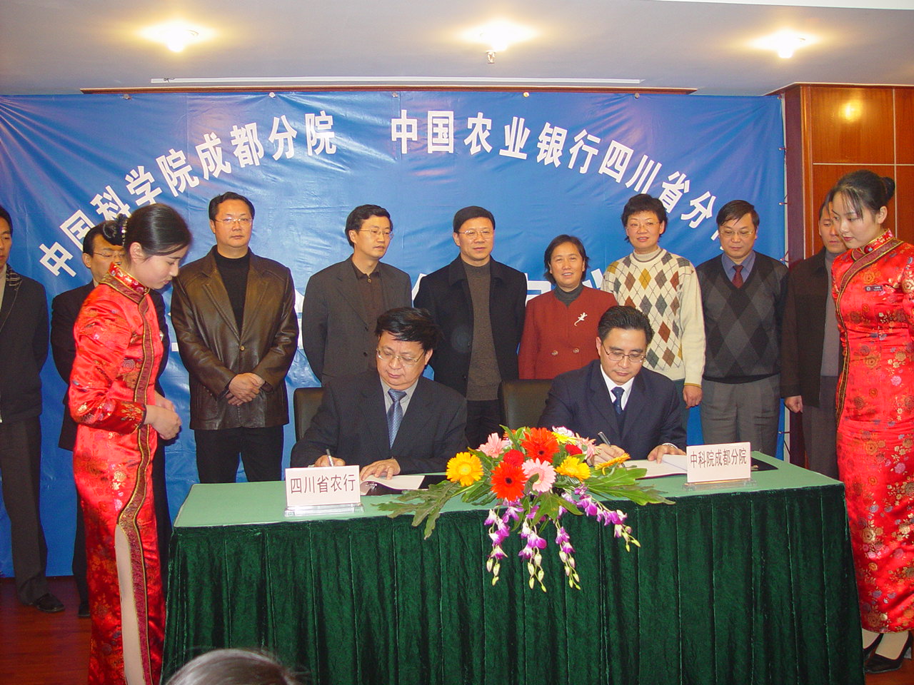 2003年12月2日,中科院成都分院与中国农业银行四川省分行“银企合作协议签字仪式”在成都京川宾馆举行。彭宇行院长和李先国行长在协议书上签字,成都分院关晓岗副院长及院属成都地区各单位有关领导、省农行段钢副行长及分行有关领导出席了签字仪式。