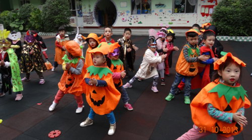 10月31日下午,孩子们穿上了五颜六色的各种怪异服装,手提一盏传说中的南瓜灯,讨糖的“巫婆”和“精灵”,“蜘蛛侠”“白雪公主”是大中班小朋友根据个人喜好装扮的,煞是可爱。他们唱着欢快的英语歌曲载歌载舞表演了精彩的节目。
