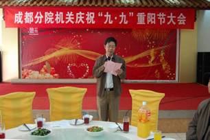 10月11日,成都分院举行“九九重阳节”庆祝活动。成都分院院长袁家虎、副院长赵永涛、党组副书记兼纪检组组长彭丽玲及分院机关各处处长出席重阳节活动,成都分院机关150多名离退休老同志参加了庆祝活动。庆祝会由彭丽玲主持。 袁家虎宣读了《致离退休老同志的慰问信》,他说,在过几天,我们将迎来老同志自己的节日—“九九重阳节”。今天我们和老领导、老同志齐聚一堂,举杯同庆。老领导、老同志是党和国家的宝贵财富,过去您们以满腔热血,为伟大祖国的科学事业、为成都分院的发展,奉献了自己的青春和力量,为社会主义建设和各项事业的发展付出了辛勤的劳动,建立了光辉的业绩。今天,您们虽然离开了原来的工作岗位,但您们用长期积累起来的丰富知识和经验,通过各种形式,为分院的改革、发展、稳定,作出了新的贡献。您们应该受到大家的尊重。关爱老同志,是我们一如既往的责任;用关心、爱心、诚心、多为大家办实事、办好事是我们的任务;为成都分院离退休同志营造一个幸福和谐的晚年生活氛围,是我们的愿望。我们要高度重视离退休工作,以深厚的感情做好离退休工作,在政治上多关心、思想上多沟通、生活上多照顾、精神上多关怀老同志, 使老同志安享晚年、健康长寿。最后,祝老年朋友们健康长寿,生活幸福! 会后,老同志进行了各种休闲娱乐活动。