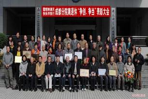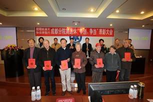 彭丽玲宣读了《中国科学院关于表彰“霞辉映满天、快乐伴我行”主题实践活动中涌现出的先进集体和个人的决定》、《中国科学院老年大学表彰老年教育先进工作者和优秀学员的通知》、《成都分院关于表彰离退休党支部争创“五好党支部”的决定》、《成都分院关于表彰离退休工作政策业务知识竞赛活动优秀单位的通知》,通报了成都分院获得院离退休研讨工作优秀组织奖和优秀成果奖的情况。对受到表彰的先进集体和个人进行了表彰,分院及各单位主管领导分别向先进集体代表和优秀个人颁发奖状。离休支部代表尹静(成都化学公司)、张礼堂(光电所)、邵学军(成都信息公司)、尹家斐(国科图成都分馆)、钟祥浩(成都山地所),老年大学学员吴志健等六位先进集体代表和个人在大会上进行了交流发言。