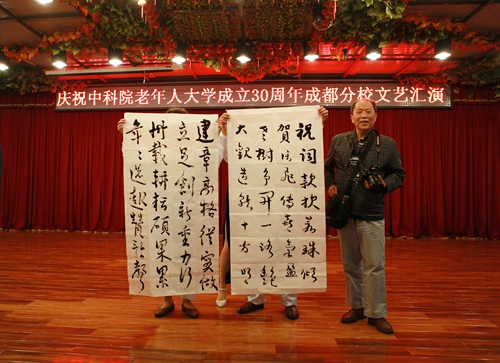 当配乐诗朗诵《老年学友》、即兴书法《嵌字祝贺中科院老大建立卅年》出现在汇演舞台上时,现场响起了热烈的掌声,这些节目以罗洪深、姜福远两位学员为校庆创作的诗歌为题材编排,是学员们对成都分校办学的肯定,也表达了他们对总校深厚的感情,更是为校庆献上的一份厚礼。
